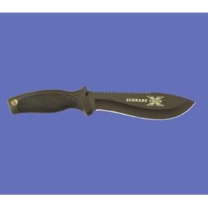 Product Description : Features: Blade length: 6.38". Overall length: 11.75". Blade steel: 440C stainless steel. Handle material: Rubber. Handle color: Black. Blade color: Black. Point: Drop point. Sheath: Nylon. Made in China.